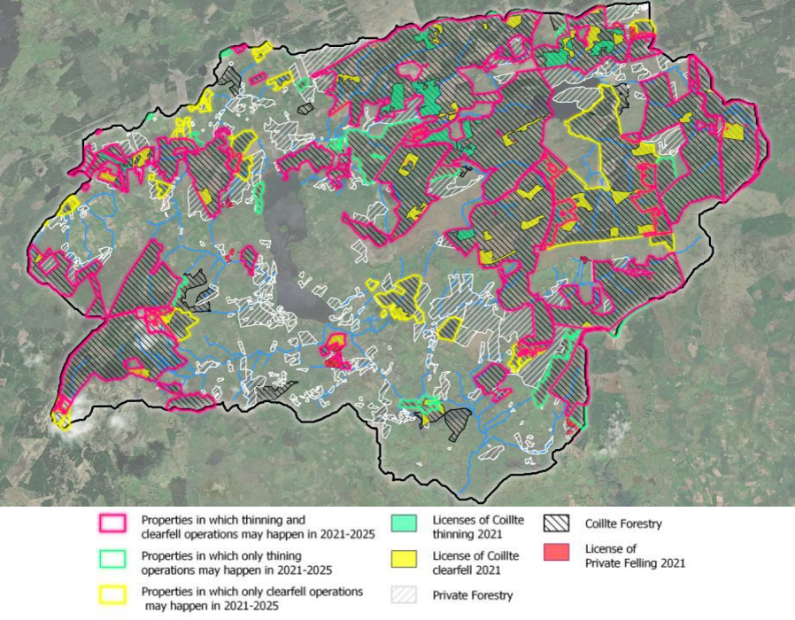 Over half of the Graney sub-catchment in South East Clare and Galway is forested – 41.8% Coillte and 11.2% private. Forestry is listed as a pressure in six of its 10 water bodies: Bleach_10; Bleach_20; Graney (Shannon)_10; Graney (Shannon)_20; Graney (Shannon)_30; Corra_20.
